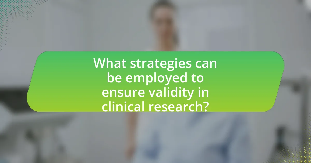 To ensure validity in clinical research, researchers can employ strategies such as randomization, blinding, and the use of control groups. Randomization minimizes selection bias by randomly assigning participants to different groups, which helps ensure that the groups are comparable. Blinding, where participants and/or researchers are unaware of group assignments, reduces bias in treatment administration and outcome assessment. Control groups provide a baseline for comparison, allowing researchers to determine the effect of the intervention more accurately. These strategies are supported by evidence indicating that they significantly enhance the internal validity of clinical trials, as demonstrated in systematic reviews and meta-analyses that highlight their effectiveness in reducing bias and confounding factors.